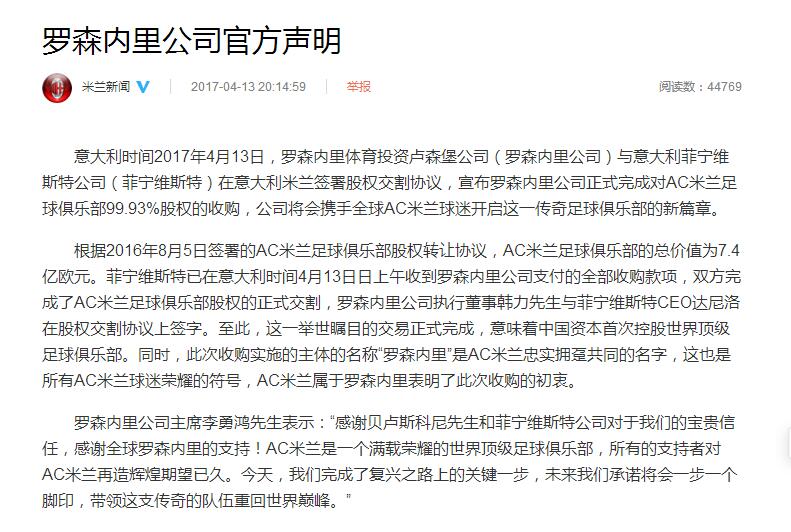 意大利時間2017年4月13日,羅森內里體育投資盧森堡公司(羅森內里公司)與意大利菲寧維斯特公司(菲寧維斯特)在意大利米蘭簽署股權交割協議,宣布羅森內里公司正式完成對AC米蘭足球俱樂部99.93%股權的收購,公司將會攜手全球AC米蘭球迷開啟這一傳奇足球俱樂部的新篇章。