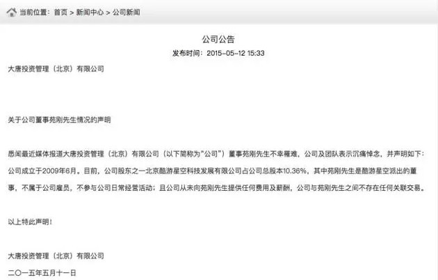 而且,2015年5月11日,大唐投資在其官網上發布了一份公告,證實了在加拿大遇害的苑剛就是公司董事。而且,公告還稱: