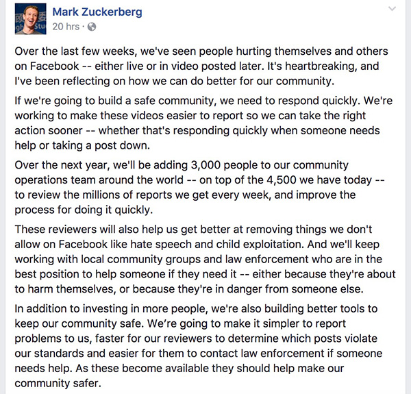 扎克伯格在個人Facebook頁面上發貼稱,若要建立一個安全的社區,Facebook需要做出迅速的反應。他補充說,過去幾周在Facebook上播出的人們自殘和傷害他人的視頻令人心痛。
