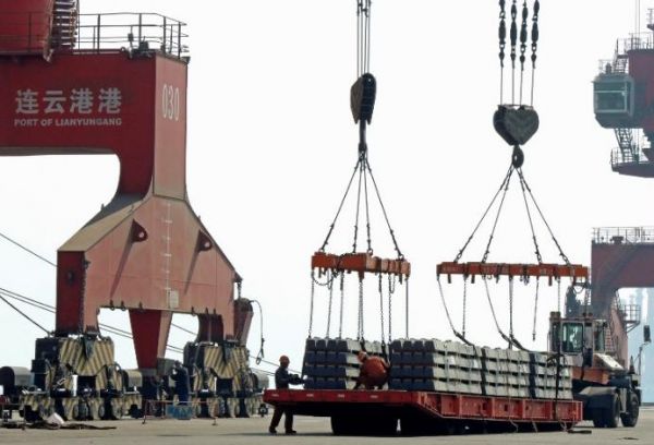 4月,中國連雲港一處碼頭的工人正在操作裝載出口物資。(法新社)