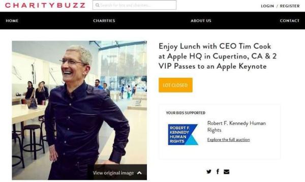蘋果CEO蒂姆·庫克(Tim Cook)的慈善午餐,最終拍出688999美元高價,創下歷史新高。