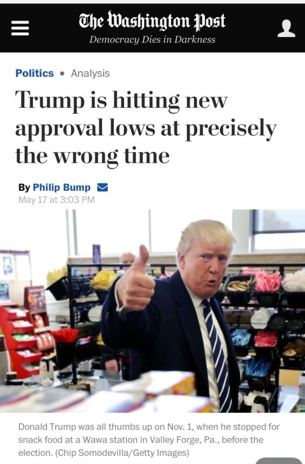 華盛頓郵報在當地時間5月17日下午發出的報道稱,過去2天之內,關于特朗普總統的壞消息對其支持率的影響,快得讓人難以解釋。美國民調公司蓋勒普(Gallup)的最新追蹤結果小時,特朗普的支持率僅有38%,是其上任以來的最低水平。