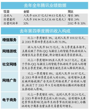 昨日,騰訊控股有限公司(00700.hk)公布截至2013年12月31日未經審核的第四季度綜合業績及經審核的全年綜合業績。2013年全年總收入為人民幣604.37億元(99.13億美元),比2012年同期增長38%。經營盈利為人民幣191.94億元(31.48億美元),比2012年同期增長24%。經營利潤率由2012年的35%降至32%。