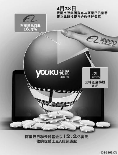 昨天下午,阿里巴巴和雲鋒基金宣布以12.2億美元購得優酷土豆A股普通股721120860股,交易完成後,阿里巴巴將持股16.5%,雲鋒基金持股2%。此外,阿里巴巴還將委派其CEO陸兆禧加入優酷土豆董事會。