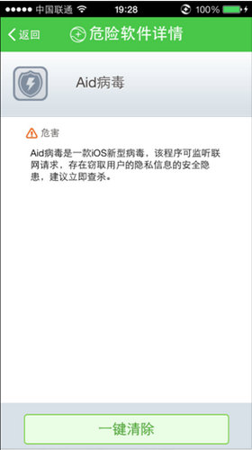 360手機安全中心目前已將該病毒的危害等級定為“高危”。分析發現,iOS越獄設備感染Aid病毒後,用戶不會有任何感知 。與“蘋果蛀蟲”病毒相同,病毒文件存放在/Library/MobileSubstrate/DynamicLibraries/ 文件夾下,主要是竊聽Apple id及其密碼。