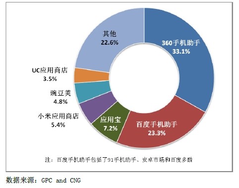 除了360手機助手以外,百度在2014年也開始逐漸將91手機助手、安卓市場和百度多酷的分發資源與百度手機助手合並,使得百度手機助手市場份額有所增長,達到23.3%。緊隨360之後;騰訊提升應用寶戰略地位後,通過微信係遊戲帶動分發,市場份額達7.2%位居第三。