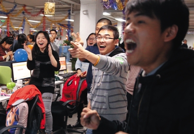11月11日淩晨0點01分,“雙十一”促銷剛開始一分鐘,位于通州的某服裝公司總部內,部分員工看著不斷攀升的銷售額,發出歡呼。新京報記者 李冬 攝