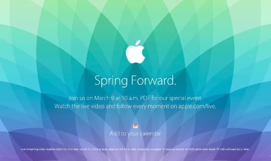 蘋果邀請函顯示,此次特別發布會將于太平洋時間3月9日上午10:00在舊金山芳草地藝術中心(Yerba Buena Center for the Arts)舉行,主題為“spring forward”(春天前行)。這一主題指美國將在3月8日將進入夏時制、鐘表向前撥快一小時。另外,結合蘋果CEO蒂姆·庫克(Tim Cook)此前曾表示“Apple Watch將在今年4月份開始發貨”,而這一主題或暗示Apple Watch將提前上市。