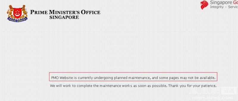 新加坡總理公署頁面,網站維護中,並未發布“李光耀病逝”的消息。