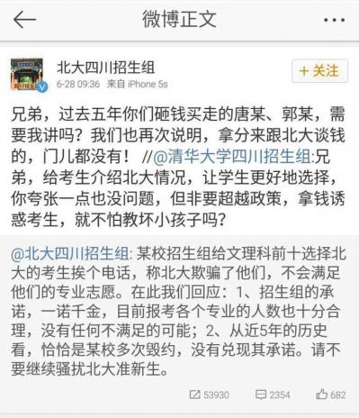 北大四川招生組則繼續轉發微博稱,“兄弟,過去五年你們砸錢買走的唐某、郭某,需要我講嗎?拿分來跟北大談錢的,門兒都沒有!”
