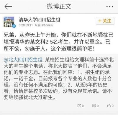 昨天早上8點13分,北大四川招生組發布置頂微博稱,“這兩天微博微信上關于招生大戰的討論極多,某校輸紅眼之後的做法讓人哭笑不得”,並倡議“不撒謊不抹黑;不通過學校、家長施加壓力;抵制漫天要價。”