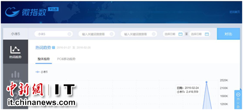 第二組數據:2月24日小米5發布會當天,小米5百度指數127萬,加小米4S、小米和小米官網等相關產品、品牌關鍵詞百度指數共計達到270萬。首先我們來了解一下何為百度指數?根據百度百科顯示百度指數是以百度海量網民行為數據為基礎的數據分享平臺,是當前互聯網乃至整個數據時代最重要的統計分析平臺之一。百度指數能夠告訴我們:某個關鍵詞在百度的搜索規模有多大,一段時間內的漲跌態勢以及相關的新聞輿論變化,關注這些詞的網民是什麼樣的,分布在哪里。