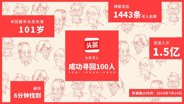 截至7月14日下午5點半,頭條尋人公益項目共推送1443條尋人尋親信息,成功找到100人,平均每周發送給2000多萬用戶,覆蓋200多個城市地區。