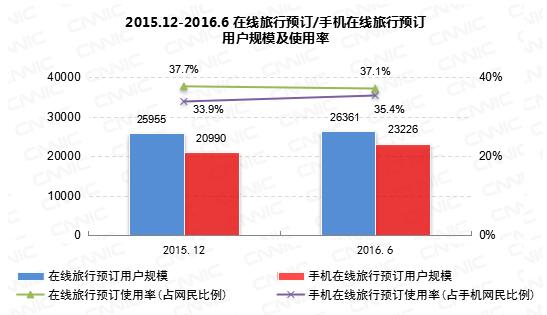 近期,中國互聯網絡信息中心 (CNNIC) 發布的《第38次中國互聯網絡發展狀況統計報告》顯示,截至2016年6月,在網上預訂過機票、酒店、火車票或旅遊度假產品的網民規模達到2.64億,較2015年底增長406萬人,增長率為1.6%。在網上預訂火車票、機票、酒店和旅遊度假產品的網民分別佔比28.9%,14.4%,15.5%和6.1%。2016年在線旅行預訂機票、酒店、旅遊度假業務的競爭已進入“紅海”,而機票預訂業務進入“提直降代”時期。