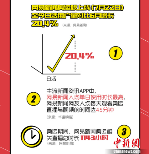 憑借內容層面的熱點多角度及時深入挖掘、以前後方直播為核心的奧運信息流式傳播以及一係列頗受年輕用戶喜愛的互動遊戲策劃,網易新聞奧運版上線(7月22日)至今DAU(日活用戶量)對比6月增長20.4%。網易新聞與全球領先的市場調研及品牌咨詢機構華通明略合作開展的《2016里約奧運主流新聞資訊App媒體價值研究》調查結果顯示,在各主流新聞資訊App產品中,網易新聞人均單日使用時長最高。