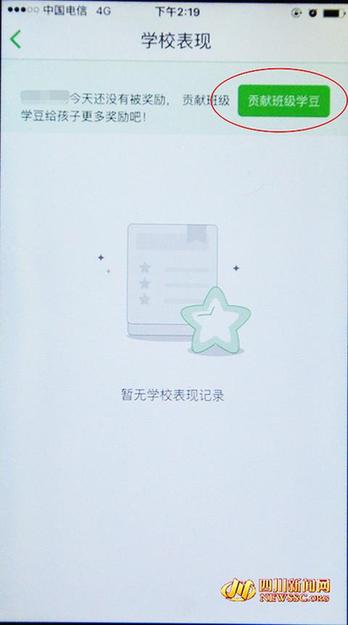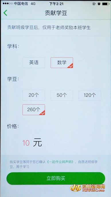 王先生告訴四川新聞網記者,他在使用“一起作業家長端”的時候還發現,在其中一個名為“學校表現”的欄目中有這樣一個提示——“xxx今天還沒有被獎勵,貢獻班級學豆給孩子更多獎勵吧!”。只要點擊“貢獻班級學豆”,馬上就會出一個充值頁面,里面可以分別購買20、50、120、260個的學豆,價格分別為1、2、5、10元。