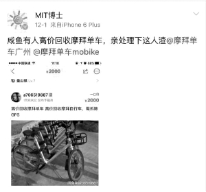 近日,有網友在 爆料稱,摩拜等共享單車的出售信息出現在一些二手車平臺上,一輛摩拜的價格在2000元左右。在某二手交易平臺上,還有人出價2000元回收摩拜單車。記者在網友發的截圖上看到,“2000元高價回收摩拜自行車”,條件是“需拆除GPS”。