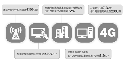 苗圩介紹說,今年,通信產業完成投資超過4300億元,全國所有地市基本建成光纖網絡城市,光纖寬帶用戶佔比達到72%,4G用戶突破7億戶,全國IPTV(交互式網絡電視)用戶已達8200萬戶;全國固定寬帶平均接入速率達到2015年的2倍;新增3個互聯網骨幹直連點,網間帶寬新擴容950G。
