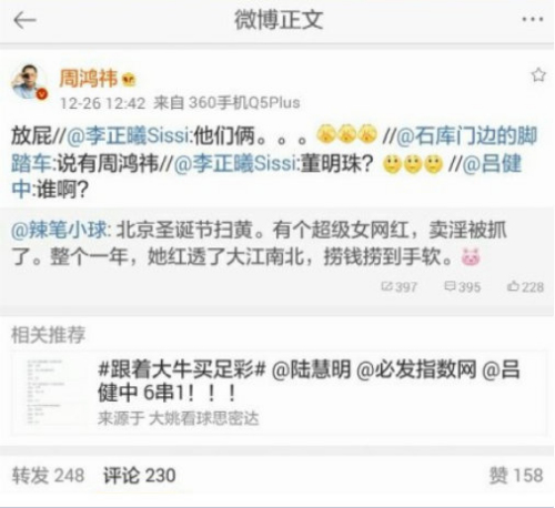 昨日,北京掃黃查封數家俱樂部,涉黃人員包括各界人士上百人的消息傳遍全網。有傳言懷疑360公司董事長兼CEO、花椒直播投資人周鴻祎被卷入該事件當中,對此,周鴻祎在微博上強烈回應“放屁”,隨後還轉發了自己在花椒上的直播澄清不實謠言,並建議其他人也用直播來證明自己的清白。
