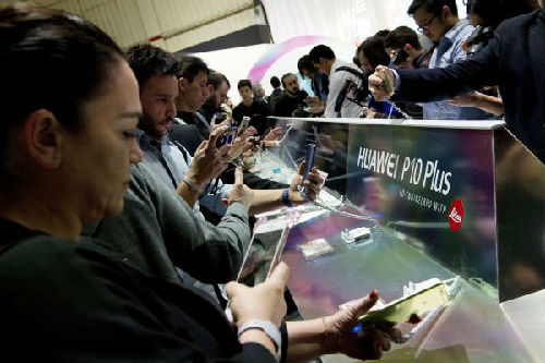 2月26日,在西班牙巴塞羅那舉行的世界移動通信大會開幕前,人們試用中國品牌華為新發布的P10和P10 Plus手機。(新華社)