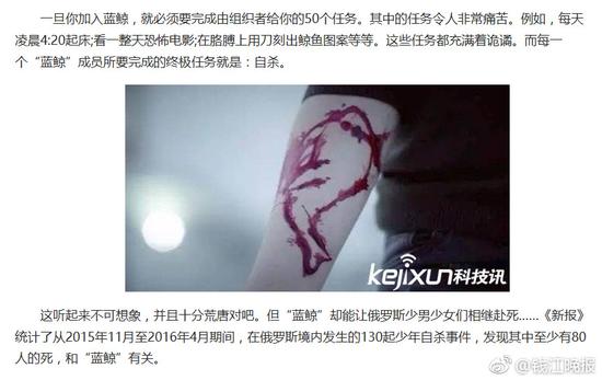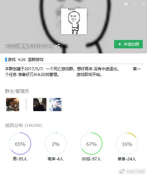 【俄羅斯死亡遊戲悄悄潛入中國!網友稱已有人組織遊戲群】《藍鯨死亡遊戲》(Blue Whale)是發源于俄羅斯的一種自殺式死亡遊戲,遊戲鼓勵玩家在50天內完成各種殘忍傷害自己的任務。很多青少年受其蠱惑結束了自己的生命!有網友舉報稱這種邪教遊戲已經流入中國,于“藍鯨”挑戰的任務之一是每天4:20起床,我國內地也出現了類似于 “4:20叫醒我” 的代號社交群。請各位家長警惕孩子手機里類似“藍鯨”、 “4:20叫醒我” 等字眼的社交群,無論是不是開玩笑,都請警惕!