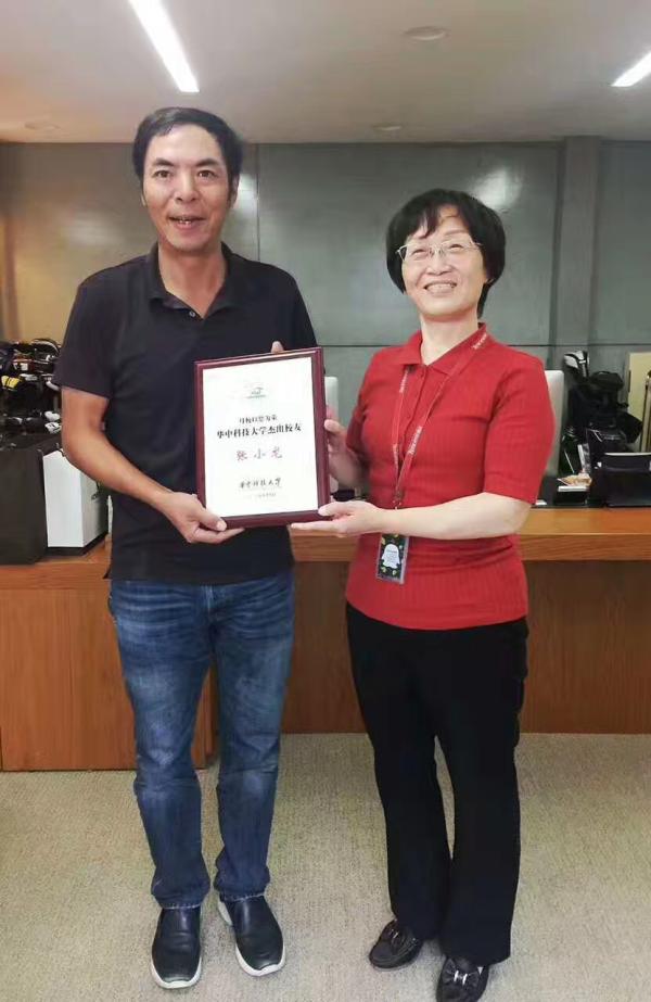 當日下午,華中科技大學校友總會副秘書長劉玉教授一行來到位于廣州微信總部,將“華中科技大學傑出校友”的獎牌鄭重地交到了微信之父張小龍手上。