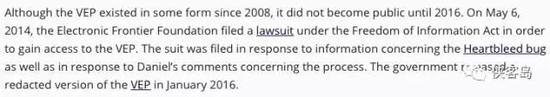 就此次而言,美國政府內部的決策流程更值得被詬病。其內部有個簡稱為VEP(Vulnerability Equity Process)的流程,其用處是,當NSA或美國其他政府部門發現一個軟件的漏洞,要走這個流程,決定是不是把漏洞公開。把漏洞公開,微軟等廠商很容易就能制造出補丁,漏洞就消失了;不把漏洞公開,這些政府部門就可以自己留著用,用于“執法、情報收集或者其他’攻擊性’利用”。雖然這一被奧巴馬政府創造的流程既不是法律也不是總統令,但從2008年一直實施至今。
