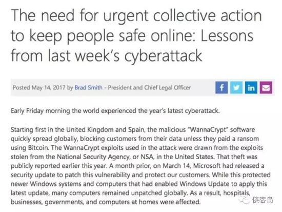 對此,微軟總裁Brad Smith也在自己的博客上憤怒地說,“如果這些政府部門繼續躲在暗處挖掘全球電腦係統的漏洞,然後制成所謂的’武器庫’用來攻擊別國或是’買賣’,那麼你們就是網絡犯罪的幫兇!”