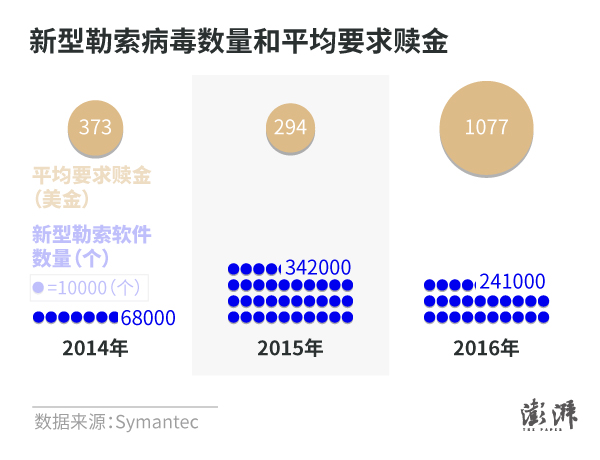 網絡安全公司賽門鐵克 ( Symantec ) 在《2017年網絡安全威脅報告》中指出,勒索病毒襲擊在近年來有愈演愈烈之勢。從賽門鐵克的監測數據來看,2016年勒索病毒攻擊事件較前年增長了36%,從34萬起上升到46.3萬起。美國是遭受勒索軟件襲擊最多的國家,佔到了34%;緊隨其後的是日本和意大利,分別佔到9%和7%。