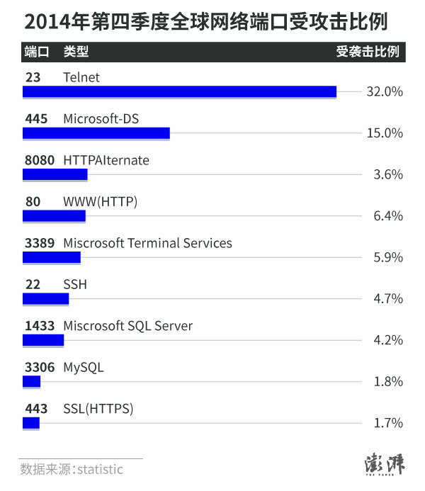 通過445端口,用戶可以在局域網中輕松訪問各種共享文件或使用共享打印機。然而,這個在“業內”毀譽參半的端口,本身也是黑客攻擊的主要目標之一。根據 statistic 的數據顯示,2014年第四季度的全球網絡襲擊中,對于445端口的襲擊佔到了15%,排在已知受攻擊端口的第二位。