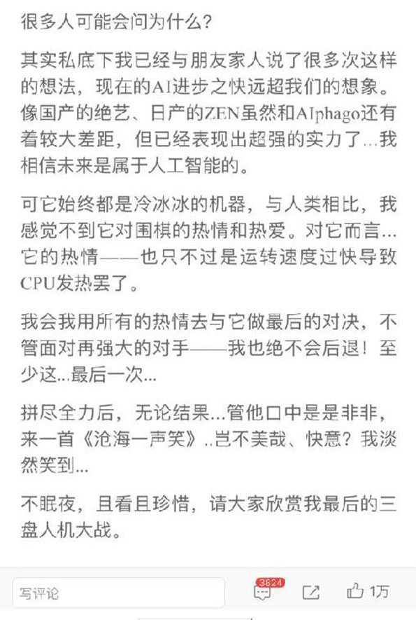 5月22日23時15分,柯潔在微博上發布了賽前的終極感想,“無論輸贏,這都將是我與人工智能最後的三盤對局。”柯潔寫道:“我相信未來是屬于人工智能的。可它始終都是冷冰冰的機器,與人類相比,我感覺不到它對圍棋的熱情和熱愛。對它而言……它的熱情——也只不過是運轉速度過快導致CPU發熱罷了。”