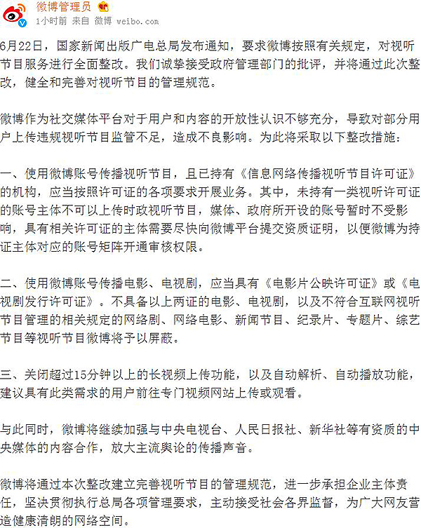 6月28日,新浪微博發布聲明稱,國家新聞出版廣電總局發布通知,要求微博按照有關規定,對視聽節目服務進行全面整改。內容涉及清理上傳時政類視聽節目的賬號;屏蔽不合規定的電影、電視劇以及網絡劇等;關閉超過15分鐘以上的長視頻上傳功能。