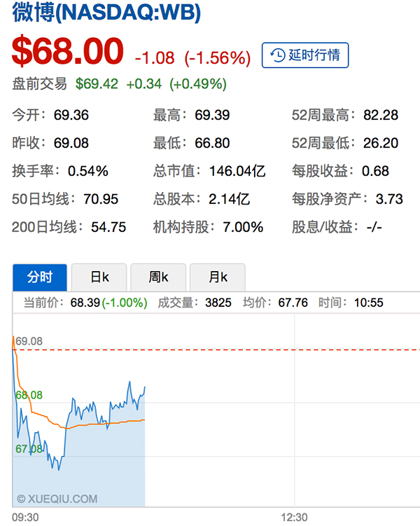 當天晚間,美股開盤,新浪微博股價小幅上漲,隨後震蕩下跌。截至發稿,跌幅不到2%。