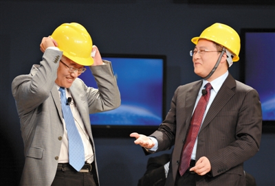 昨日,在2013大連夏季達沃斯論壇,網秦董事長林宇(右)給北京大學經濟學教授張維迎(左)戴安全帽。林宇認為,張維迎常為民營企業發聲,有時難免“躺著中槍”,需要這頂帽子保安全。新華社記者 楊青 攝