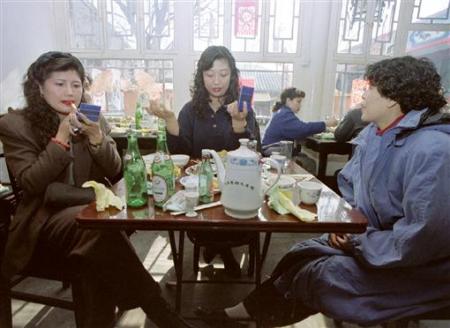 1994年2月25日,北京,婦女在飯店用餐後補妝。“下館子”和“紅嘴唇”是當時人們對經濟寬裕與化妝的理解。