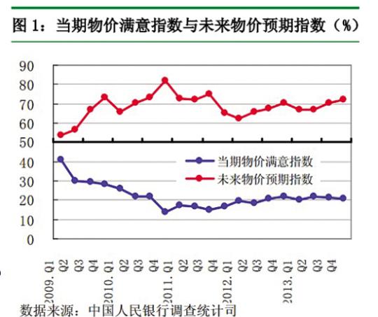 據悉,“城鎮儲戶調查報告”是2013年第四季度央行在全國50個城市進行了2萬戶城鎮儲戶問卷調查得出的數據。報告顯示,61.6%的居民認為物價“高,難以接受”,比上季上升1.8個百分點。居民未來物價預期指數為72.2%,比上季提高1.7個百分點。其中,44.5%的居民預期下季物價水平“上升”。
