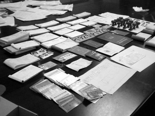 利用偽造發票、證件、印章詐騙醫療基金案件層出不窮,暴露醫療資金監管體係漏洞。圖為2009年安徽省蕪湖市警方成功破獲的一起詐騙農村醫療基金案件,現場查獲了各類假發票、印章等物件。CFP供圖