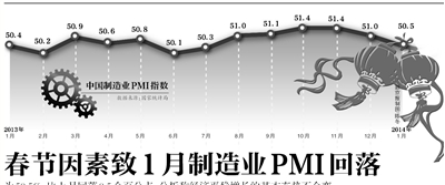 在國家統計局服務業調查中心高級統計師趙慶河看來,2014年1月PMI的回落主要受春節臨近因素影響。巴克萊資本首席中國經濟學家常健也表示,中國農歷新年往往是造成1月份或2月份PMI指數下降的原因,而今年春節剛好是1月31日,這是造成波動的一部分原因。