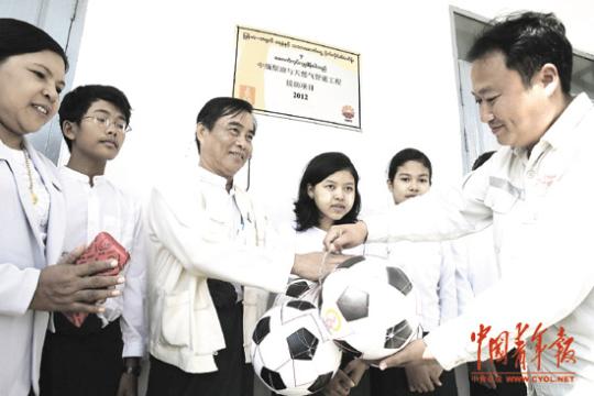 位于緬甸若開邦皎漂鎮的島英中學,中石油援建的新校舍前,中石油的員工向學校贈送足球。本報記者 陳劍攝