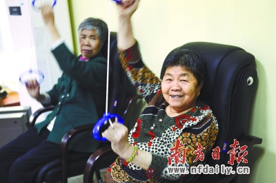 祖廟街道居家養老服務中心新星分中心,幾名長者在護理室進行提拉運動的訓練。