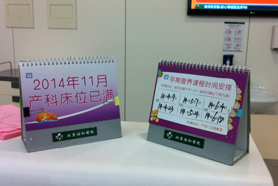 北京協和醫院產科門診的分診臺上早在3月初就已經擺出有“2014年11月產科床位已滿”字樣的臺歷。據了解,懷孕4周多的準媽媽已經無望在協和醫院產科建檔了。協和醫院門口遊蕩的黃牛表示有辦法幫超過孕周的準媽媽建檔,但是要花20000-30000元來打點關係。