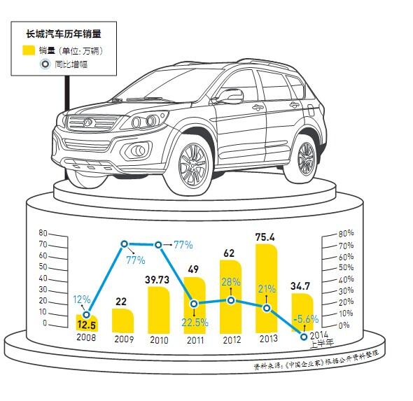 在銷量持續高漲之後,長城汽車在2014年銷量開始由增轉降。繼2014年上半年銷量出現小幅下滑後,7月份銷量再度下滑19.7%,其中轎車業務下滑尤為明顯。作為長城汽車挺進高端SUV的代表之作,哈弗H8兩度爽約,上市時間仍不明朗。6月,有傳言稱長城汽車將在年內裁員兩萬人,隨後長城汽車予以否認。有接近長城汽車的人士告訴《中國企業家》,長城內部正在進行一場大規模的組織架構調整。