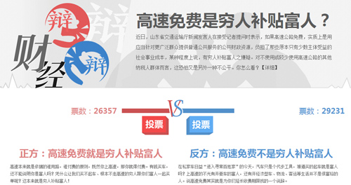 對此,人民財經推出《高速公路免費是窮人補貼富人?》的辯論,讓網友通過留言的形式來為自己支持的觀點投票。截至發稿,共有55588名網友參與辯論,超過五成網友支持反方觀點,認為高速免費並非窮人補貼富人。此外,還有千余名網友留言各抒己見。