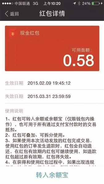 如今羊年春節臨近,馬雲不淡定了,昨天臘月二十三小年,支付寶宣稱到春節將發放6億元大紅包!上午10點是第一波,派1000萬現金和3000萬購物紅包。13分鐘後支付寶稱有210萬人中獎,朋友圈卻哀嚎一片,大多數人沒搶到,搶到的只有5毛8或20元餐飲代金券,還有“不實用”的海外旅遊券……