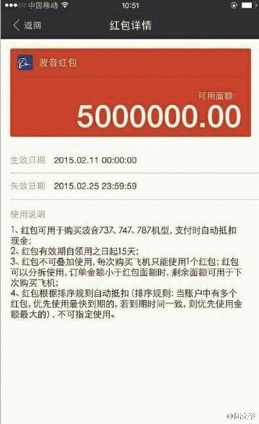 其實,彼時彼刻,大家對紅包已經有些審美疲勞,倒是段子手靈感頻出,還有人P圖稱“搶到瑪莎拉蒂15元代金券”“搶到500萬波音飛機的消費紅包”。