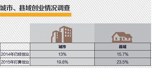 值得注意的是,大調查所抽取的104個城市樣本和300個縣域樣本顯示,無論是2014年已經創業的比例,還是2015年打算創業的比例,縣域受訪者都高于城市受訪者。因此未來創業的主力軍,很可能來自縣域。