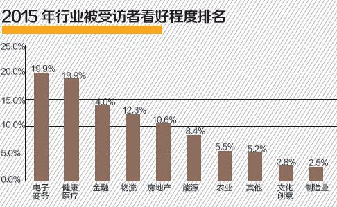 而對于2014年已經創業和2015年正準備創業的受訪者中,最為看好的行業中排在前三位的依然是健康醫療(20.1%)、電子商務(19%)和金融業(14.1%),與全體受訪者略有區別的是,相對于電子商務,健康醫療產業似乎更被創業者們所看好。而在他們心目中,制造業的排名也依然排在墊底的位置。