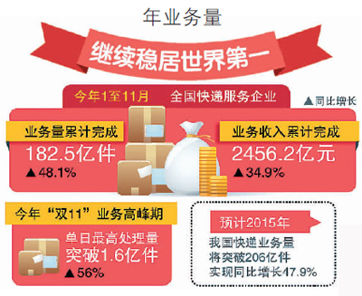 國家郵政局相關負責人介紹,在“十二五”初期,2015年快遞業務量目標定為61億件。“十二五”期間,我國快遞業年均增速達54.6%。在經濟下行壓力增大的背景下,如此高速增長的行業並不多見。