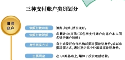 如今這個問題得到解決。“互聯網銀行將可以開設II類、III類銀行賬戶。”中國人民銀行支付結算司司長謝眾表示,這包括直銷銀行和網商銀行以及微眾銀行。央行通過將銀行賬戶分為三級,並採取相應的日均消費限額的手段,解決了技術限制、風控要求與使用便捷三者的平衡。
