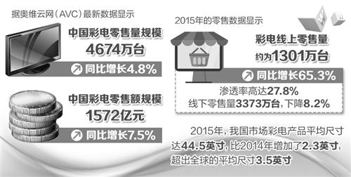 據奧維雲網(AVC)最新數據顯示,2015年中國彩電銷售量價齊升,零售量規模為4674萬臺,同比增長4.8%;零售額規模1572億元,同比增長7.5%;市場均價3363元,同比增長2.6%。應該說,去年彩電業整體表現遠超業界預期。